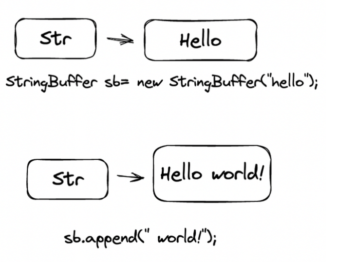 StringBuffer sb = new StringBuffer("hello"); sb.append(" world!");📌 StringBuffer vs StringBuilder