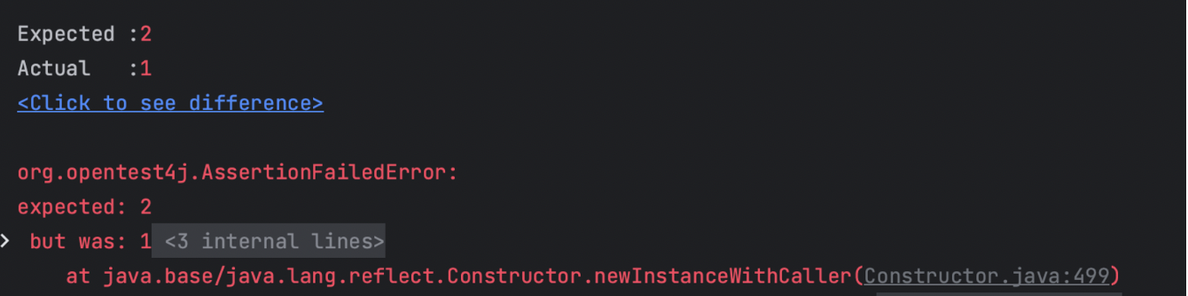 @Test void assertThatTest() { // given // when // then assertThat(1).isEqualTo(1); assertThat(2).isEqualTo(2); assertThat(1).isEqualTo(2); assertThat(1).isEqualTo(3); }결과