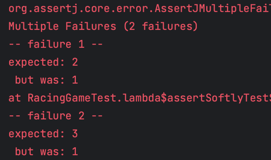 우테코 프리코스 - 자동차 경주 게임 미션을 진행하면서 하나의 테스트 함수에서 기능에 대해 여러 결과를 검증하기 위해서 assertThat() 을 여러 번 이용해 검증을 했다.