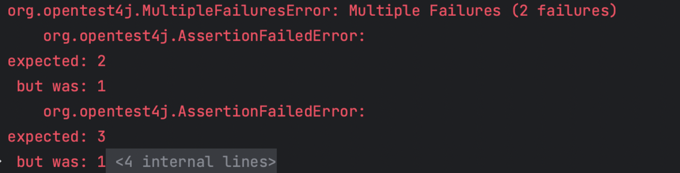 @Test void assertAllTest() { // given // when // then assertAll( () -> assertThat(1).isEqualTo(1), () -> assertThat(2).isEqualTo(2), () -> assertThat(1).isEqualTo(2), () -> assertThat(1).isEqualTo(3) ); }결과