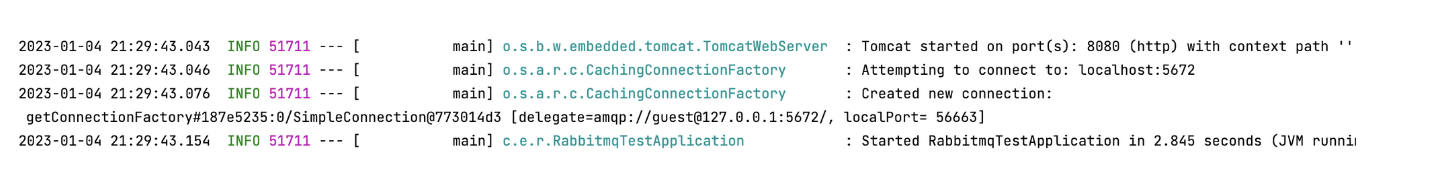 - RabbitMQ 연결정보와 연결되었다는 메시지가 출력된다.