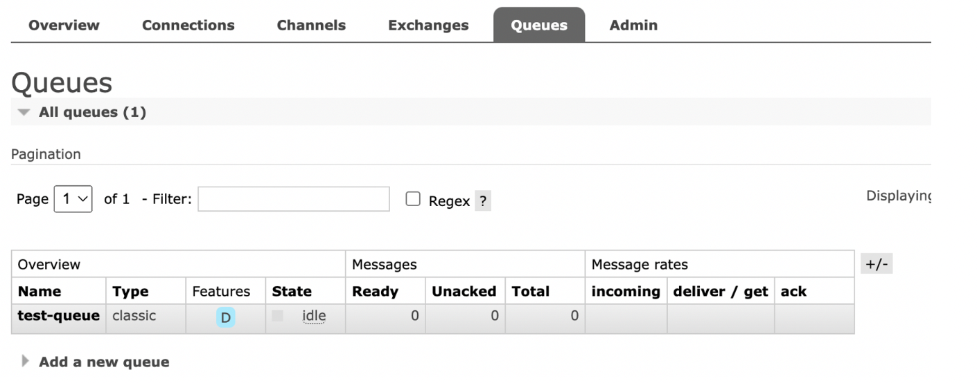 - 클릭시 해당 queue에 대한 정보를 확인할 수 있고 메시지 송/수신 등 Queue에 대한 기능을 수행할 수 있다.