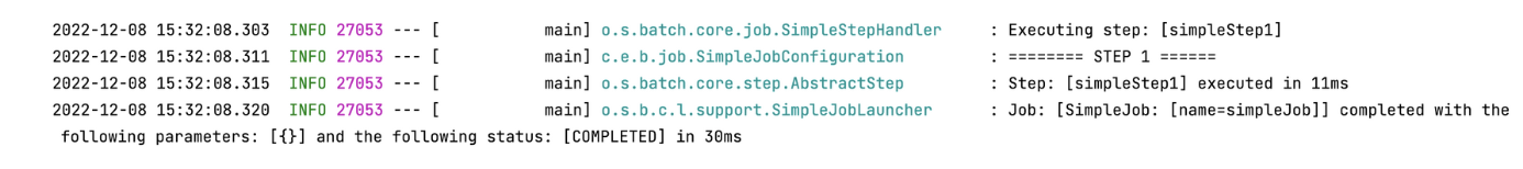 plugins { id 'java' id 'org.springframework.boot' version '2.7.4' id 'io.spring.dependency-management' version '1.1.0' } group = 'com.example' version = '0.0.1-SNAPSHOT' sourceCompatibility = '17' configurations { compileOnly { extendsFrom annotationProcessor } } repositories { mavenCentral() } dependencies { implementation 'org.springframework.boot:spring-boot-starter-batch' implementation 'org.springframework.boot:spring-boot-starter-data-jpa' implementation 'org.springframework.boot:spring-boot-starter-web' compileOnly 'org.projectlombok:lombok' runtimeOnly 'com.h2database:h2' runtimeOnly 'mysql:mysql-connector-java' annotationProcessor 'org.projectlombok:lombok' testImplementation 'org.springframework.boot:spring-boot-starter-test' testImplementation 'org.springframework.batch:spring-batch-test' } ...Simple Job 생성