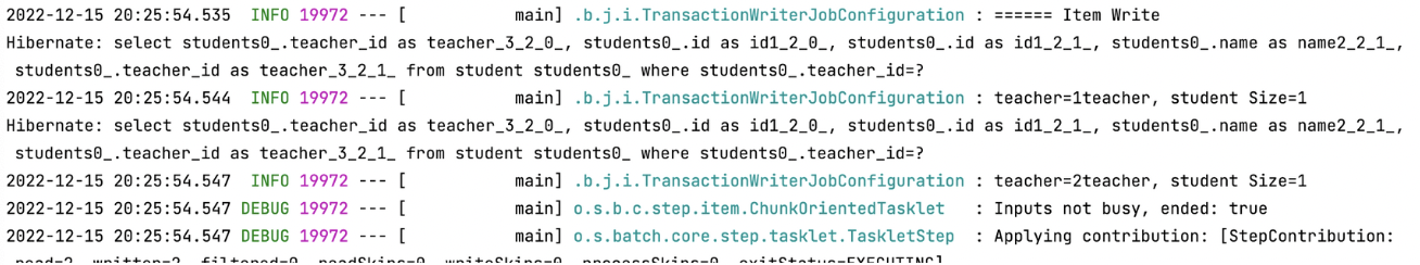 @Slf4j @RequiredArgsConstructor @Configuration public class TransactionWriterJobConfiguration { public static final String JOB_NAME = "transactionWriterBatch"; public static final String BEAN_PREFIX = JOB_NAME + "_"; private final JobBuilderFactory jobBuilderFactory; private final StepBuilderFactory stepBuilderFactory; private final EntityManagerFactory emf; @Value("${chunkSize:1000}") private int chunkSize; @Bean(JOB_NAME) public Job transactionWriterJob() { return jobBuilderFactory.get(JOB_NAME) .preventRestart() .start(transactionWriterStep()) .build(); } @Bean(BEAN_PREFIX + "step") @JobScope public Step transactionWriterStep() { return stepBuilderFactory.get(BEAN_PREFIX + "step") .<Teacher, Teacher>chunk(chunkSize) .reader(transactionWriterReader()) .writer(transactionWriter()) .build(); } @Bean public JpaPagingItemReader<Teacher> transactionWriterReader() { return new JpaPagingItemReaderBuilder<Teacher>() .name(BEAN_PREFIX+"reader") .entityManagerFactory(emf) .pageSize(chunkSize) .queryString("SELECT t FROM Teacher t") .build(); } private ItemWriter<Teacher> transactionWriter() { return items -> { log.info("====== Item Write"); for (Teacher item : items) { log.info("teacher={}, student Size={}", item.getName(), item.getStudents().size()); } }; } }- Reader에서 Teacher Entity를 반환하여 Processor를 거치지 않고 바로 Writer로 넘겨