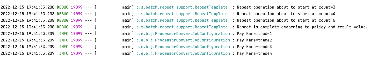@Slf4j @RequiredArgsConstructor @Configuration public class ProcessorConvertJobConfiguration { public static final String JOB_NAME = "ProcessorConvertBatch"; public static final String BEAN_PREFIX = JOB_NAME + "_"; private final JobBuilderFactory jobBuilderFactory; private final StepBuilderFactory stepBuilderFactory; private final EntityManagerFactory emf; @Value("${chunkSize:1000}") private int chunkSize; @Bean(JOB_NAME) public Job job() { return jobBuilderFactory.get(JOB_NAME) .preventRestart() .start(step()) .build(); } @Bean(BEAN_PREFIX + "step") @JobScope public Step step() { return stepBuilderFactory.get(BEAN_PREFIX + "step") .<Pay, String>chunk(chunkSize) .reader(reader()) .processor(processor()) .writer(writer()) .build(); } @Bean public JpaPagingItemReader<Pay> reader() { return new JpaPagingItemReaderBuilder<Pay>() .name(BEAN_PREFIX+"reader") .entityManagerFactory(emf) .pageSize(chunkSize) .queryString("SELECT p FROM Pay p") .build(); } @Bean public ItemProcessor<Pay, String> processor() { return pay -> { return pay.getTxName(); }; } private ItemWriter<String> writer() { return items -> { for (String item : items) { log.info("Pay Name={}", item); } }; } }- Pay 클래스를 읽어와 name 필드(String 타입)을 Writer에 넘긴다.