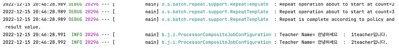@Slf4j @RequiredArgsConstructor @Configuration public class ProcessorCompositeJobConfiguration { public static final String JOB_NAME = "processorCompositeBatch"; public static final String BEAN_PREFIX = JOB_NAME + "_"; private final JobBuilderFactory jobBuilderFactory; private final StepBuilderFactory stepBuilderFactory; private final EntityManagerFactory emf; @Value("${chunkSize:1000}") private int chunkSize; @Bean(JOB_NAME) public Job compositeJob() { return jobBuilderFactory.get(JOB_NAME) .preventRestart() .start(compositeStep()) .build(); } @Bean(BEAN_PREFIX + "step") @JobScope public Step compositeStep() { return stepBuilderFactory.get(BEAN_PREFIX + "step") .<Teacher, String>chunk(chunkSize) .reader(compositeReader()) .processor(compositeProcessor()) .writer(compositeWriter()) .build(); } @Bean public JpaPagingItemReader<Teacher> compositeReader() { return new JpaPagingItemReaderBuilder<Teacher>() .name(BEAN_PREFIX+"reader") .entityManagerFactory(emf) .pageSize(chunkSize) .queryString("SELECT t FROM Teacher t") .build(); } @Bean public CompositeItemProcessor compositeProcessor() { List<ItemProcessor> delegates = new ArrayList<>(2); delegates.add(compositeProcessor1()); delegates.add(compositeProcessor2()); CompositeItemProcessor processor = new CompositeItemProcessor<>(); processor.setDelegates(delegates); return processor; } public ItemProcessor<Teacher, String> compositeProcessor1() { return Teacher::getName; } public ItemProcessor<String, String> compositeProcessor2() { return name -> " 안녕하세요 : "+ name + "입니다."; } private ItemWriter<String> compositeWriter() { return items -> { for (String item : items) { log.info("Teacher Name={}", item); } }; } }- 첫 번째 processor 에서 “Teacher Name = “