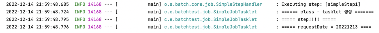 @Slf4j @Component @StepScope public class SimpleJobTasklet implements Tasklet { @Value("#{jobParameters[requestDate]}") private String requestDate; public SimpleJobTasklet() { log.info("====== class - tasklet 생성 ======="); } @Override public RepeatStatus execute(StepContribution contribution, ChunkContext chunkContext) throws Exception { log.info("===== step!!!! ====="); log.info("===== requestDate = {} ====", requestDate); return RepeatStatus.FINISHED; } }→ 메소드의 파라미터로 Job Parameter를 할당받지 않고, 클래스의 멤버 변수로 Job Parameter를 할당 받도록 하였다.